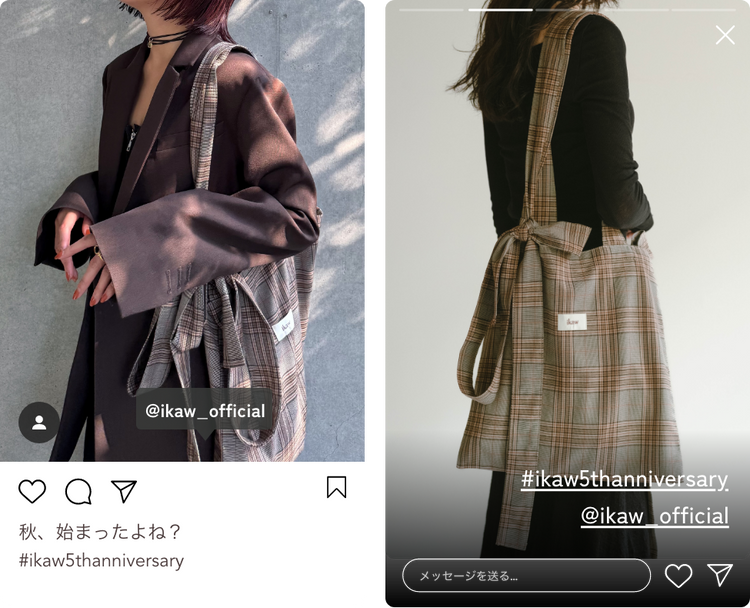 期間中に、ikaw5周年オリジナルトートバッグを使ったコーディネートやアレンジをインスタグラムに投稿してあなたのコーディネートを共有してください。