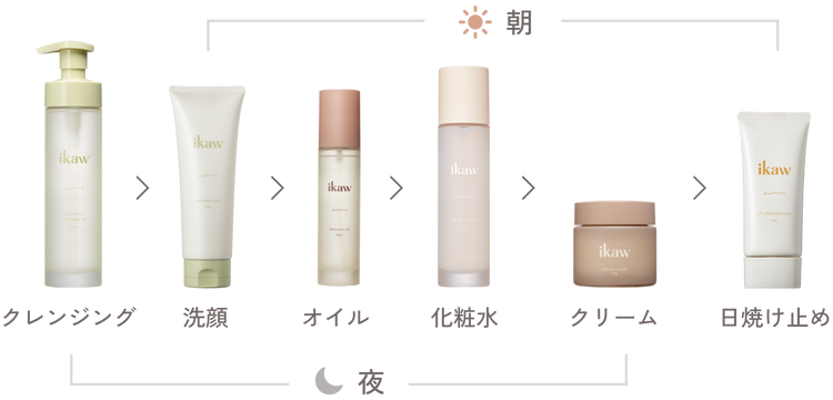 お風呂上がりなど、肌が蒸気や水分を含みやすい状態のときは、肌表面のバランスが乱れがちです。まずは肌を落ち着かせるために一番最初にikawスキンケアオイルを。そのあとに美容液、ユアスキンローション、ソフトスキンクリームの順で重ねてください。(①スキンケアオイル → ②美容液 → ③ユアスキンローション → ④ソフトスキンクリーム)